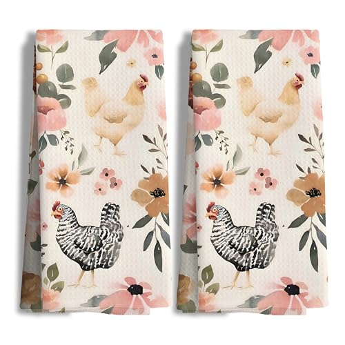 乡村鸡主题厨房毛巾2入组(16x24吋),花卉鸡图案设计吸水耐用
