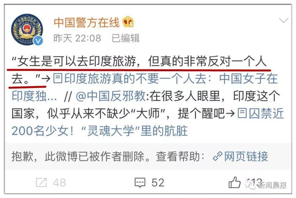 中国警方在线官方微博也站出来喊话,呼吁女孩子们不要单独去印度旅游: